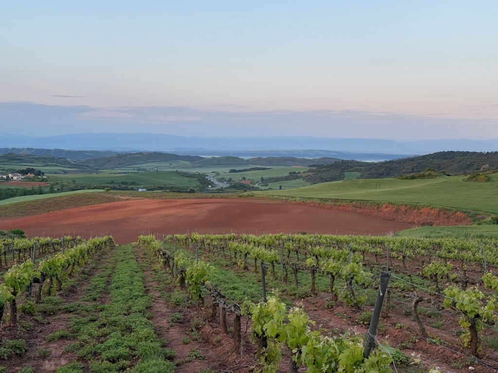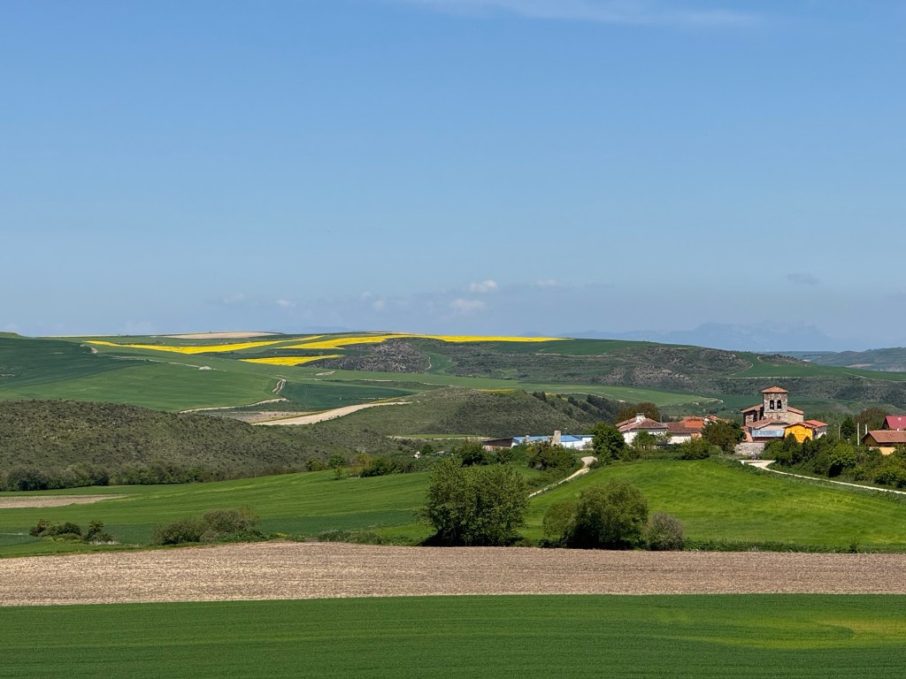 The stretch from Cirueña to Santo Domingo was the highlight of the day. Vast wheat fields, their green tips swaying in the breeze, blended into vineyards that seemed to roll on forever. The scene was so perfectly pastoral—gentle hills under a wide sky—that I half-expected to see the Windows XP logo in the corner.
