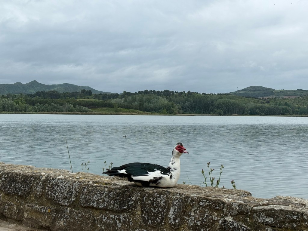 Over seven miles, the farmland shifted to an industrial area. Eventually a park marked the entrance to Logroño. I crossed the city, stopping at a big church and a supermarket for food: a bag of rolls, a stick of butter, and strawberry jam. Leaving Logroño, the path hugged a large reservoir before veering toward Navarrete.